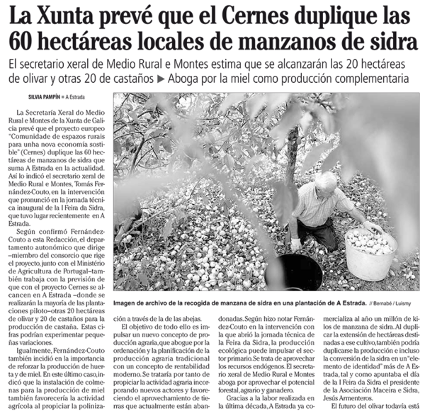 La Xunta prevé que el Cernes duplique las 60 hectáreas locales demanzanos de sidra. El secretario xeral de Medio Rural e Montes estima que se alcanzarán las 20 hectáreas de olivar y otras 20 de castaños. Aboga por la miel como producción complementaria